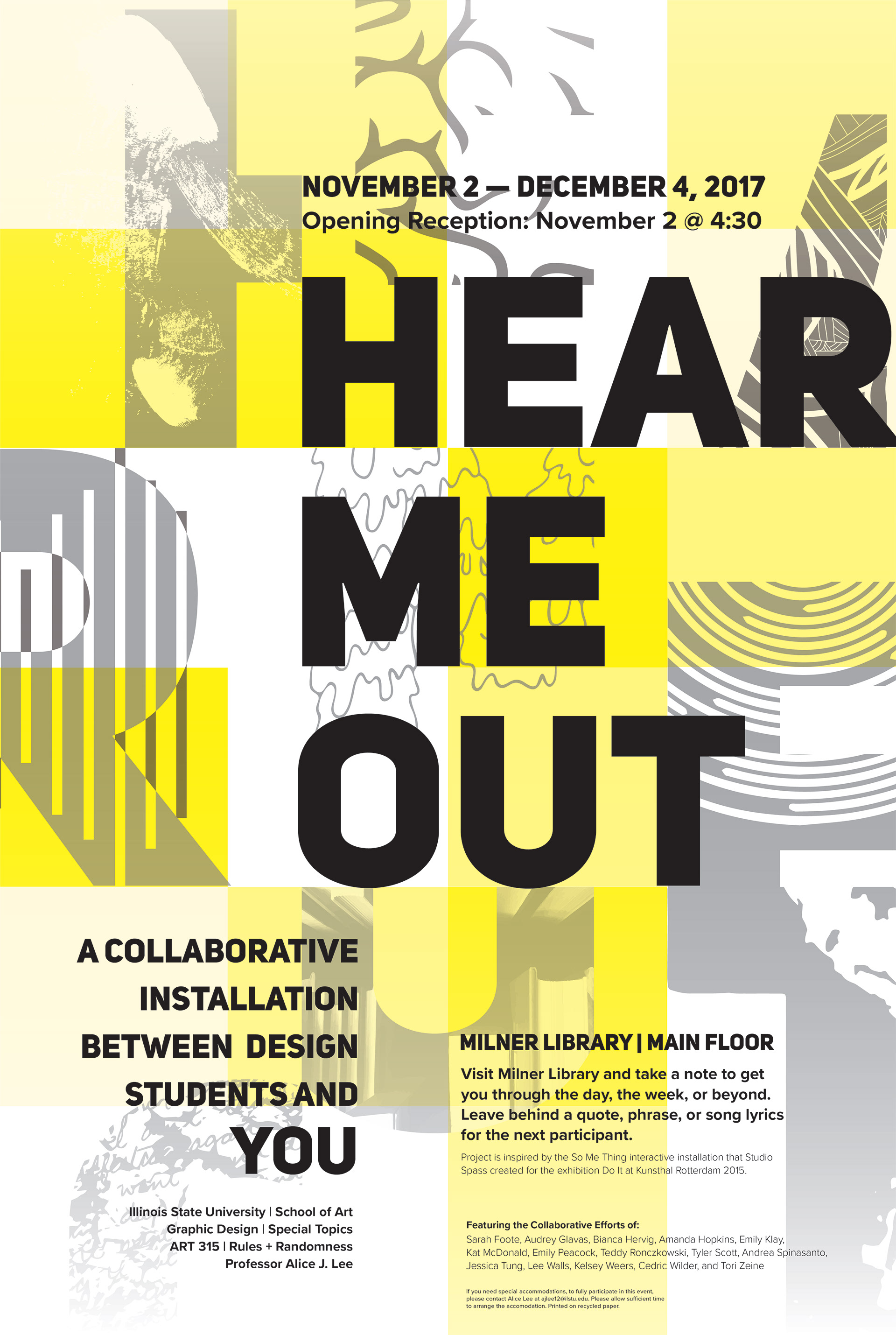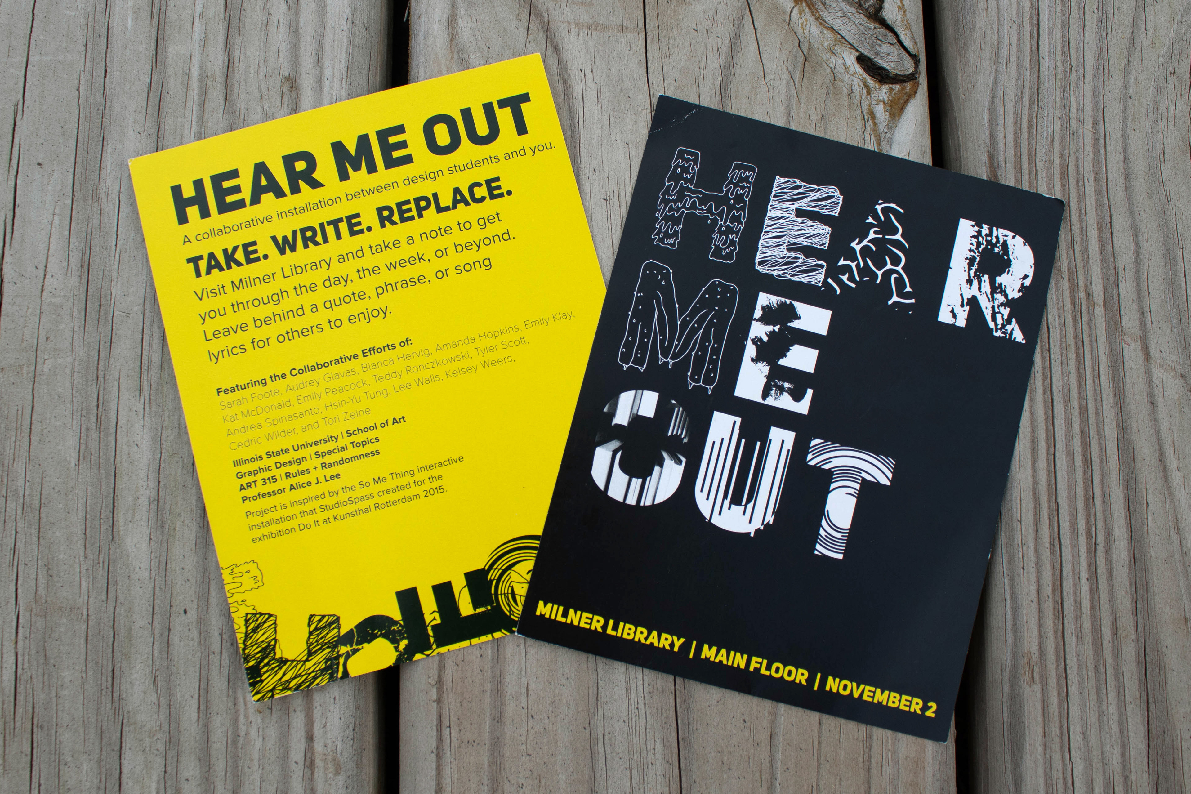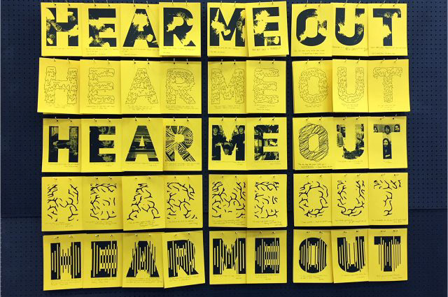 "Hear Me Out" is a collaborative interactive installation graphic design students brought to the student body to help bring comfort to those feeling stressed or having a bad day. Each design student created a typeface that embodied a randomly chosen song lyric. Passerby could read and take a letter that made an impact on them. In return, they would write a quote that helped them on a new letter, replacing the one they took.